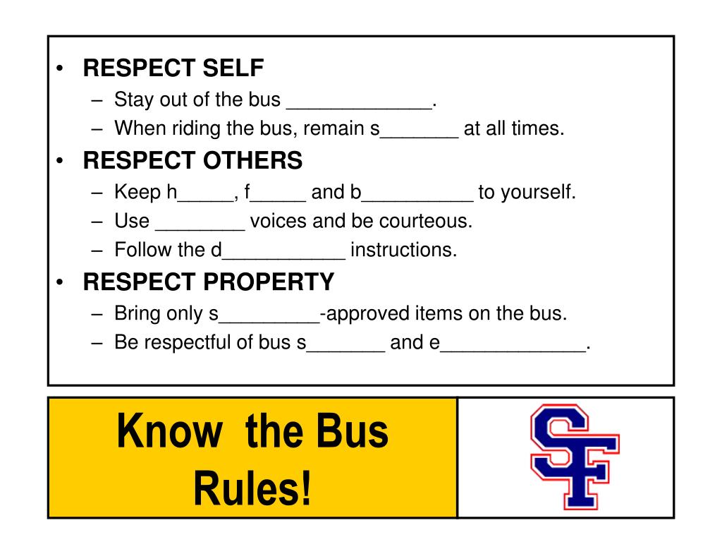 Know the Bus Rules! • RESPECT SELF • Stay out of the bus _____________. • When riding the bus, remain s_______ at all times. • RESPECT OTHERS • Keep h_____, f_____ and b__________ to yourself. • Use ________ voices and be courteous. • Follow the d___________ instructions. • RESPECT PROPERTY • Bring only s_________-approved items on the bus. • Be respectful of bus s_______ and e_____________.