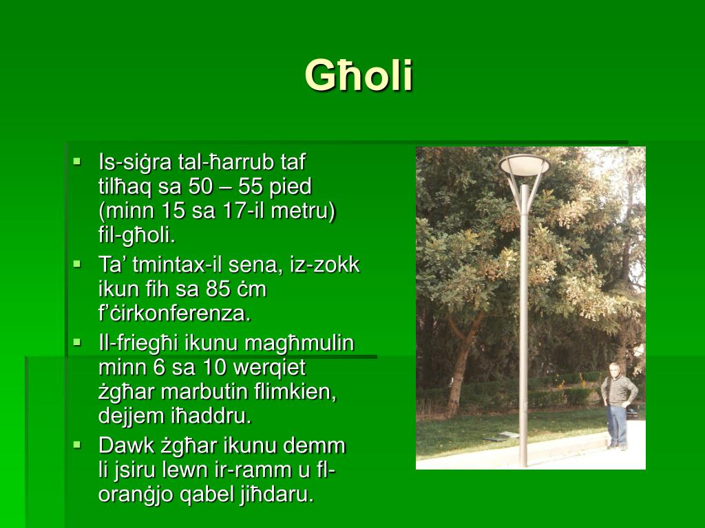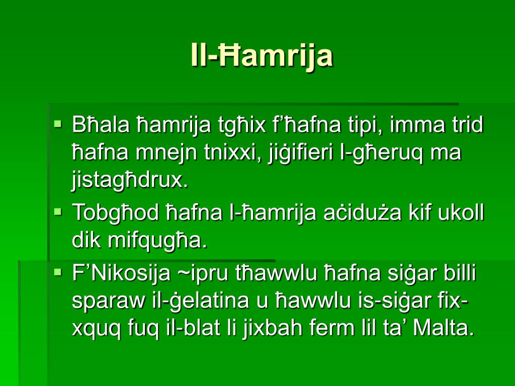 Il-Ħamrija • Bħala ħamrija tgħix f’ħafna tipi, imma trid ħafna mnejn tnixxi, jiġifieri l-għeruq ma jistagħdrux. • Tobgħod ħafna l-ħamrija aċiduża kif ukoll dik mifqugħa. • F’Nikosija ~ipru tħawwlu ħafna siġar billi sparaw il-ġelatina u ħawwlu is-siġar fix-xquq fuq il-blat li jixbah ferm lil ta’ Malta.