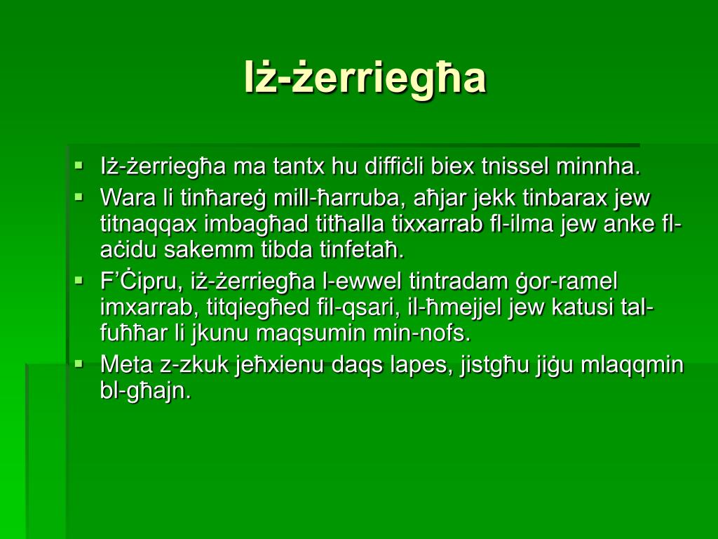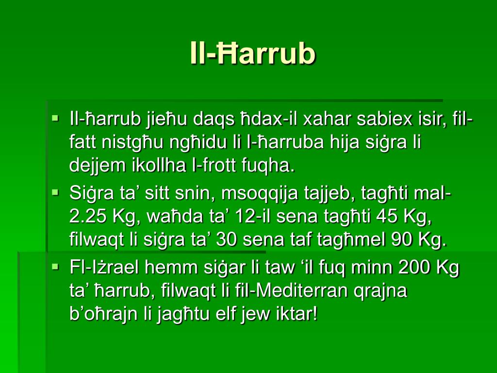 Il-Ħarrub • Il-ħarrub jieħu daqs ħdax-il xahar sabiex isir, fil-fatt nistgħu ngħidu li l-ħarruba hija siġra li dejjem ikollha l-frott fuqha. • Siġra ta’ sitt snin, msoqqija tajjeb, tagħti mal-2.25 Kg, waħda ta’ 12-il sena tagħti 45 Kg, filwaqt li siġra ta’ 30 sena taf tagħmel 90 Kg. • Fl-Iżrael hemm siġar li taw ‘il fuq minn 200 Kg ta’ ħarrub, filwaqt li fil-Mediterran qrajna b’oħrajn li jagħtu elf jew iktar!