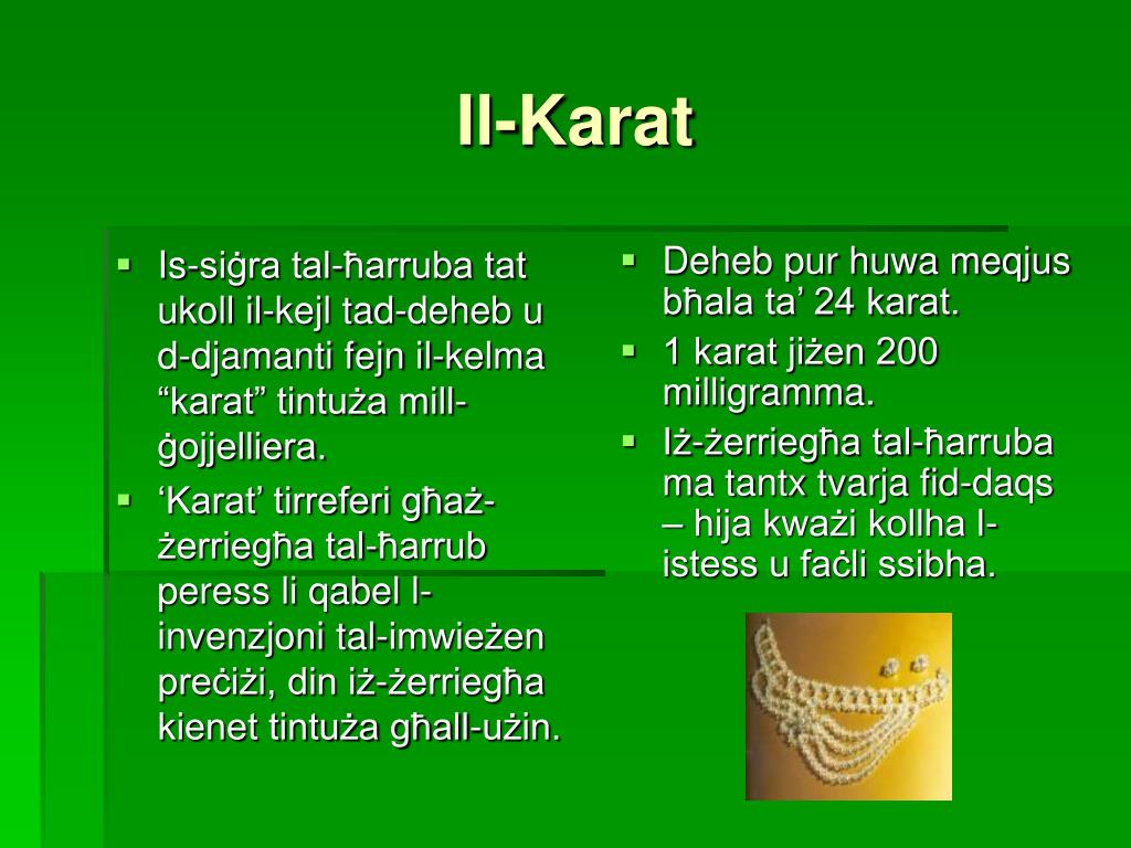 Is-siġra tal-ħarruba tat ukoll il-kejl tad-deheb u d-djamanti fejn il-kelma “karat” tintuża mill-ġojjelliera. ‘Karat’ tirreferi għaż-żerriegħa tal-ħarrub peress li qabel l-invenzjoni tal-imwieżen preċiżi, din iż-żerriegħa kienet tintuża għall-użin. Deheb pur huwa meqjus bħala ta’ 24 karat. 1 karat jiżen 200 milligramma. Iż-żerriegħa tal-ħarruba ma tantx tvarja fid-daqs – hija kważi kollha l-istess u faċli ssibha. Il-Karat