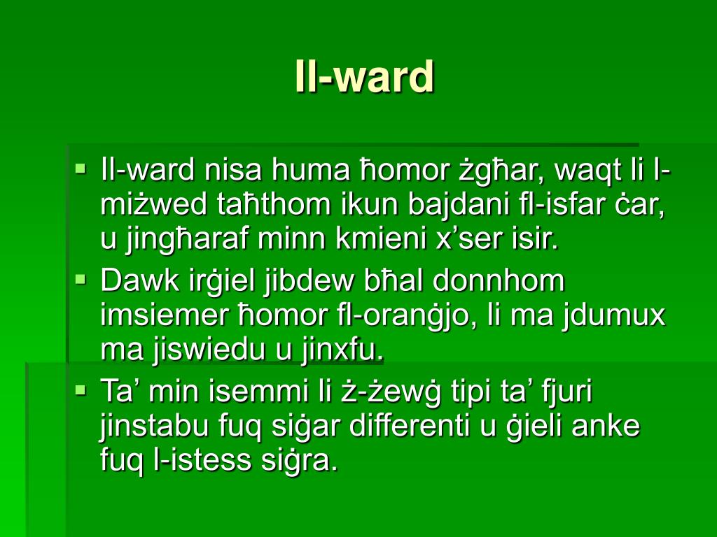 Il-ward • Il-ward nisa huma ħomor żgħar, waqt li l-miżwed taħthom ikun bajdani fl-isfar ċar, u jingħaraf minn kmieni x’ser isir. • Dawk irġiel jibdew bħal donnhom imsiemer ħomor fl-oranġjo, li ma jdumux ma jiswiedu u jinxfu. • Ta’ min isemmi li ż-żewġ tipi ta’ fjuri jinstabu fuq siġar differenti u ġieli anke fuq l-istess siġra.