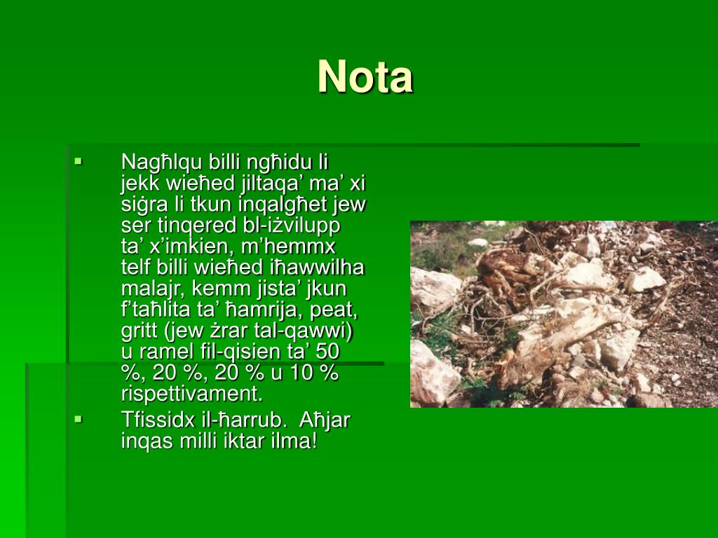 Nota • Nagħlqu billi ngħidu li jekk wieħed jiltaqa’ ma’ xi siġra li tkun inqalgħet jew ser tinqered bl-iżvilupp ta’ x’imkien, m’hemmx telf billi wieħed iħawwilha malajr, kemm jista’ jkun f’taħlita ta’ ħamrija, peat, gritt (jew żrar tal-qawwi) u ramel fil-qisien ta’ 50 %, 20 %, 20 % u 10 % rispettivament. • Tfissidx il-ħarrub. Aħjar inqas milli iktar ilma!