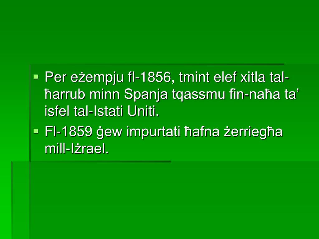 Per eżempju fl-1856, tmint elef xitla tal-ħarrub minn Spanja tqassmu fin-naħa ta’ isfel tal-Istati Uniti. • Fl-1859 ġew impurtati ħafna żerriegħa mill-Iżrael.