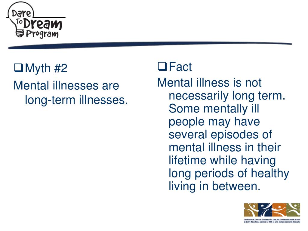 Myth #2 Mental illnesses are long-term illnesses. Fact Mental illness is not necessarily long term. Some mentally ill people may have several episodes of mental illness in their lifetime while having long periods of healthy living in between.
