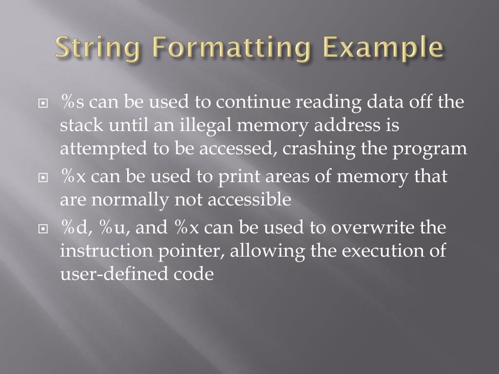String Formatting Example • %s can be used to continue reading data off the stack until an illegal memory address is attempted to be accessed, crashing the program • %x can be used to print areas of memory that are normally not accessible • %d, %u, and %x can be used to overwrite the instruction pointer, allowing the execution of user-defined code