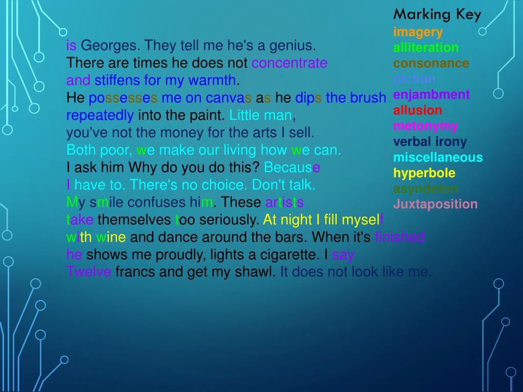 Marking Key imageryalliterationconsonance dictionenjambmentallusionmetonymyverbal ironymiscellaneoushyperboleasyndetonJuxtaposition is Georges. They tell me he's a genius.There are times he does not concentrateand stiffens for my warmth.Hepossesses me on canvasashedips the brushrepeatedly into the paint. Little man,you've not the money for the arts I sell.Both poor, we make our living how wecan.I ask him Why do you do this? BecauseI have to. There's no choice. Don't talk.My smile confuses him. These artiststakethemselvestoo seriously. At night I fill myselfwithwineand dance around the bars. When it's finishedheshows me proudly, lights a cigarette. I sayTwelvefrancs and get my shawl. It does not look like me.