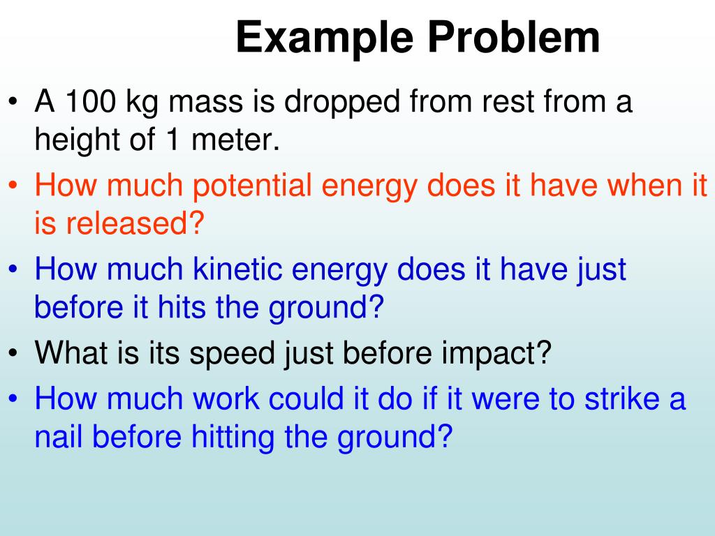 Example Problem • A 100 kg mass is dropped from rest from a height of 1 meter. • How much potential energy does it have when it is released? • How much kinetic energy does it have just before it hits the ground? • What is its speed just before impact? • How much work could it do if it were to strike a nail before hitting the ground?