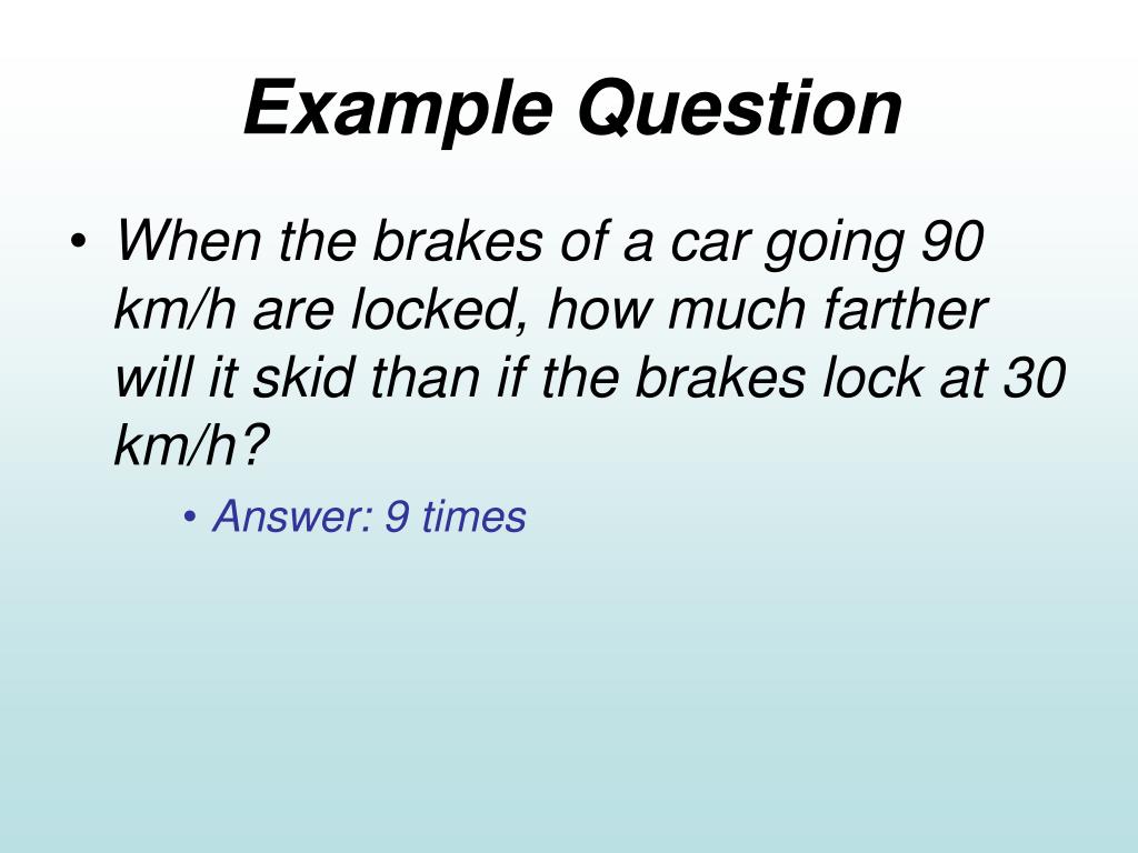 Example Question When the brakes of a car going 90 km/h are locked, how much farther will it skid than if the brakes lock at 30 km/h? Answer: 9 times
