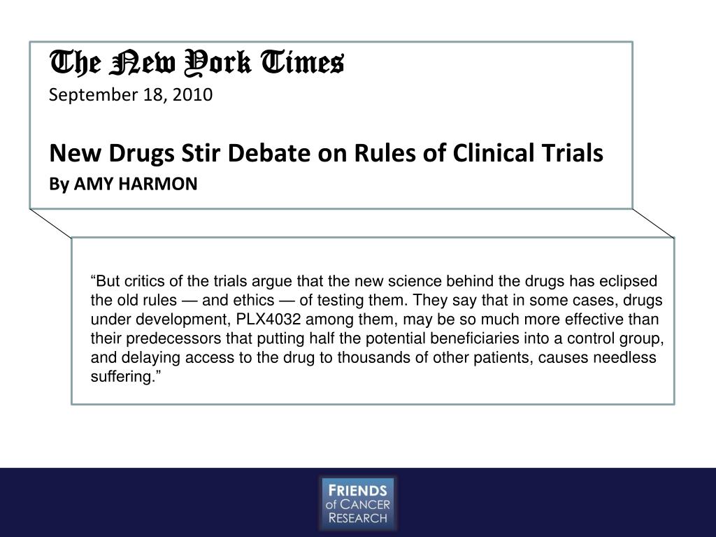 The New York Times September 18, 2010 New Drugs Stir Debate on Rules of Clinical Trials By AMY HARMON “But critics of the trials argue that the new science behind the drugs has eclipsed the old rules — and ethics — of testing them. They say that in some cases, drugs under development, PLX4032 among them, may be so much more effective than their predecessors that putting half the potential beneficiaries into a control group, and delaying access to the drug to thousands of other patients, causes needless suffering.”