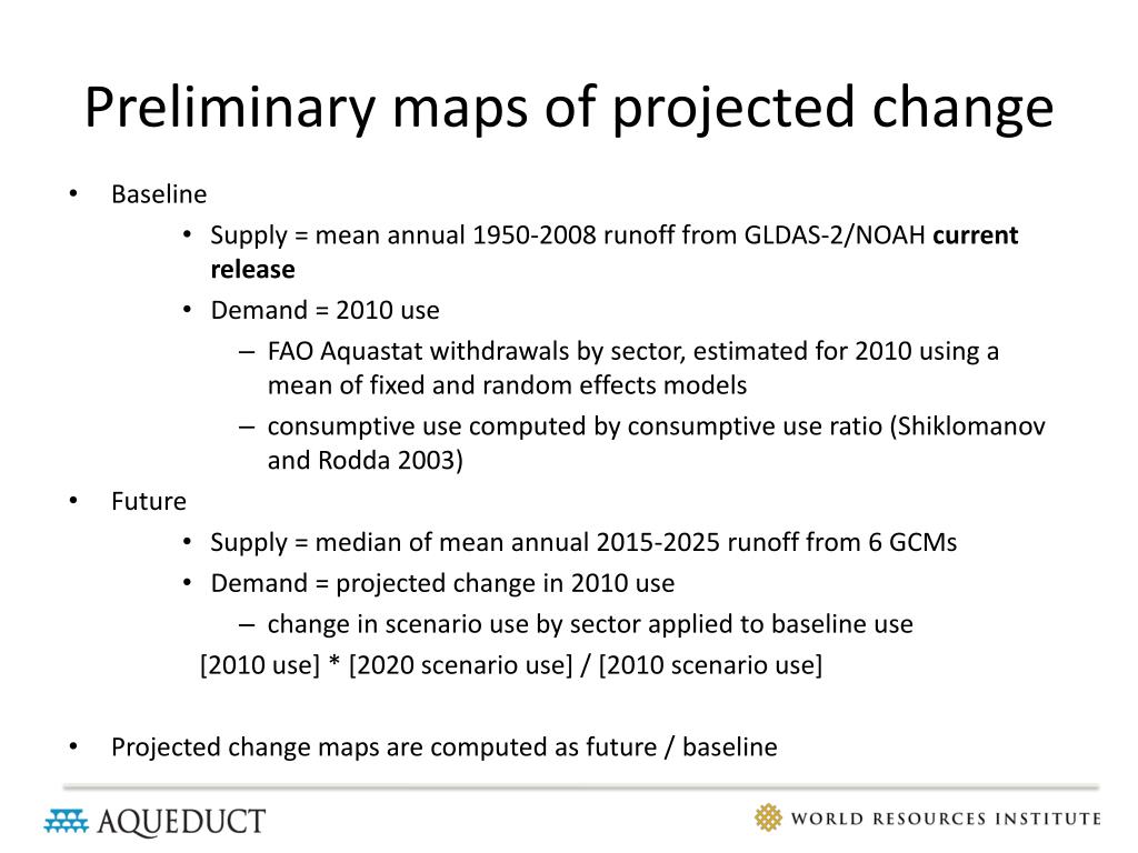 Preliminary maps of projected change • Baseline • Supply = mean annual 1950-2008 runoff from GLDAS-2/NOAH current release • Demand = 2010 use • FAO Aquastat withdrawals by sector, estimated for 2010 using a mean of fixed and random effects models • consumptive use computed by consumptive use ratio (Shiklomanov and Rodda 2003) • Future • Supply = median of mean annual 2015-2025 runoff from 6 GCMs • Demand = projected change in 2010 use • change in scenario use by sector applied to baseline use [2010 use] * [2020 scenario use] / [2010 scenario use] • Projected change maps are computed as future / baseline