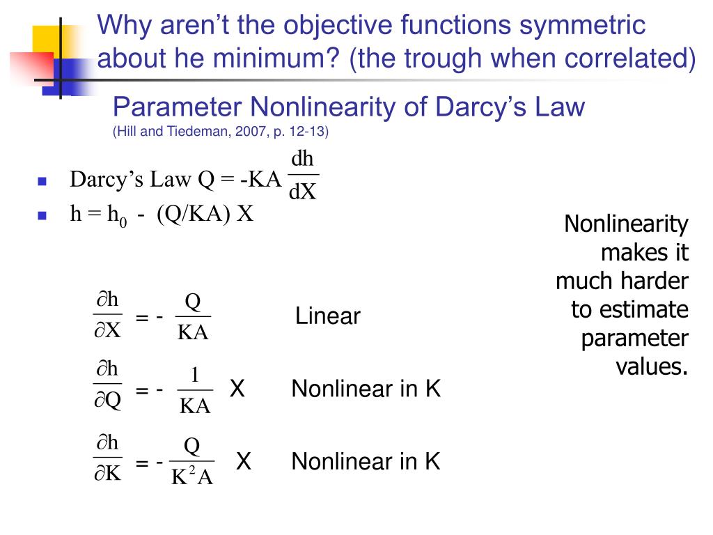 Why aren’t the objective functions symmetric about he minimum? (the trough when correlated) Parameter Nonlinearity of Darcy’s Law(Hill and Tiedeman, 2007, p. 12-13) • Darcy’s Law Q = -KA • h = h0 - (Q/KA) X = - Linear = - X Nonlinear in K = - X Nonlinear in K Nonlinearity makes it much harder to estimate parameter values.