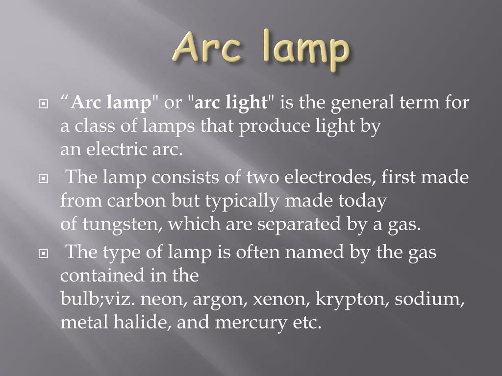 Arc lamp • “Arc lamp" or "arc light" is the general term for a class of lamps that produce light by an electric arc. • The lamp consists of two electrodes, first made from carbon but typically made today of tungsten, which are separated by a gas. • The type of lamp is often named by the gas contained in the bulb;viz. neon, argon, xenon, krypton, sodium, metal halide, and mercury etc.