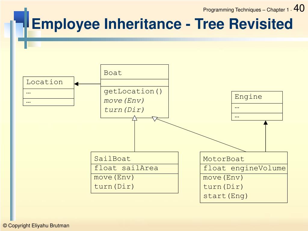 Location … … Engine … … Employee Inheritance - Tree Revisited Boat getLocation() move(Env) turn(Dir) SailBoat float sailArea move(Env) turn(Dir) MotorBoat float engineVolume move(Env) turn(Dir) start(Eng)