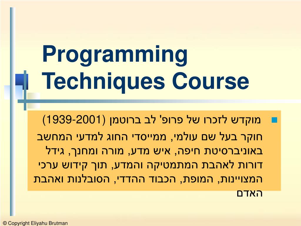 Programming Techniques Course • מוקדש לזכרו של פרופ' לב ברוטמן (1939-2001) חוקר בעל שם עולמי, ממייסדי החוג למדעי המחשב באוניברסיטת חיפה, איש מדע, מורה ומחנך, גידל דורות לאהבת המתמטיקה והמדע, תוך קידוש ערכי המצויינות, המופת, הכבוד ההדדי, הסובלנות ואהבת האדם