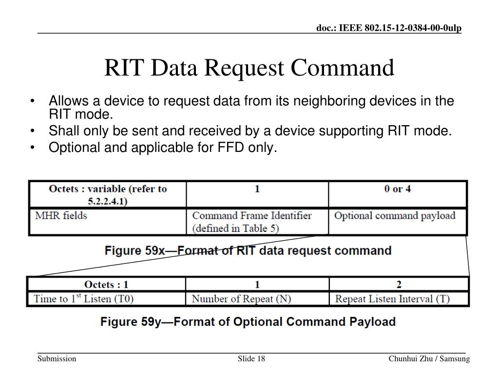 Allows a device to request data from its neighboring devices in the RIT mode. Shall only be sent and received by a device supporting RIT mode. Optional and applicable for FFD only. RIT Data Request Command Chunhui Zhu / Samsung