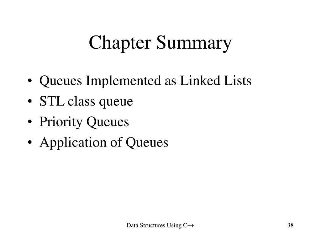 Chapter Summary • Queues Implemented as Linked Lists • STL class queue • Priority Queues • Application of Queues Data Structures Using C++