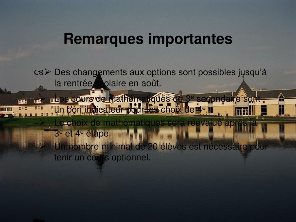 Remarques importantes • Des changements aux options sont possibles jusqu’à la rentrée scolaire en août. • Les cours de mathématiques de 3e secondaire sont un bon indicateur pour les choix de 4e. • Le choix de mathématiques sera réévalué après la 3e et 4e étape. • Un nombre minimal de 20 élèves est nécessaire pour tenir un cours optionnel.