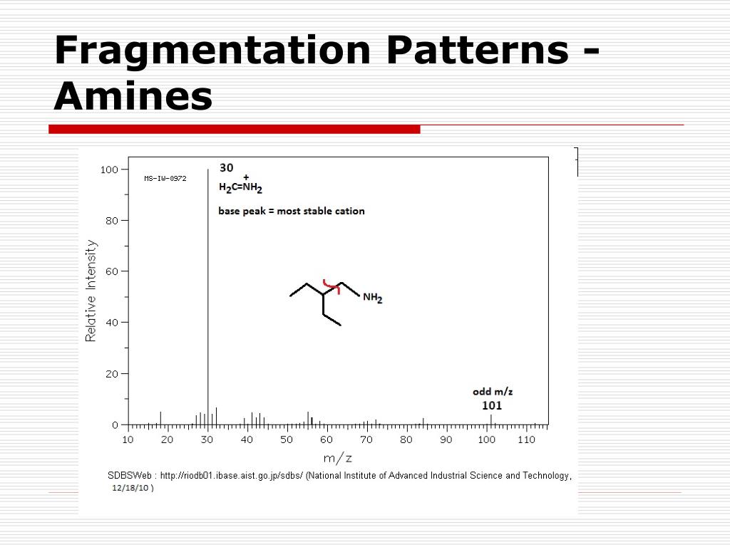 Fragmentation Patterns - halogens • Chlorine has 3:1 ratio of 35Cl : 37Cl • Look for peaks at 35 and 37 • Look for a gap of 35. • Look for M:M+2 ratio of 3:1. • Bromine has 1:1 ratio of 79Br : 81Br • Look for peaks at 79 and 81 • Look for a gap of 79. • Look for M:M+2 ratio of 1:1. • Iodine • Look for peak at 127. • Look for a gap of 127.