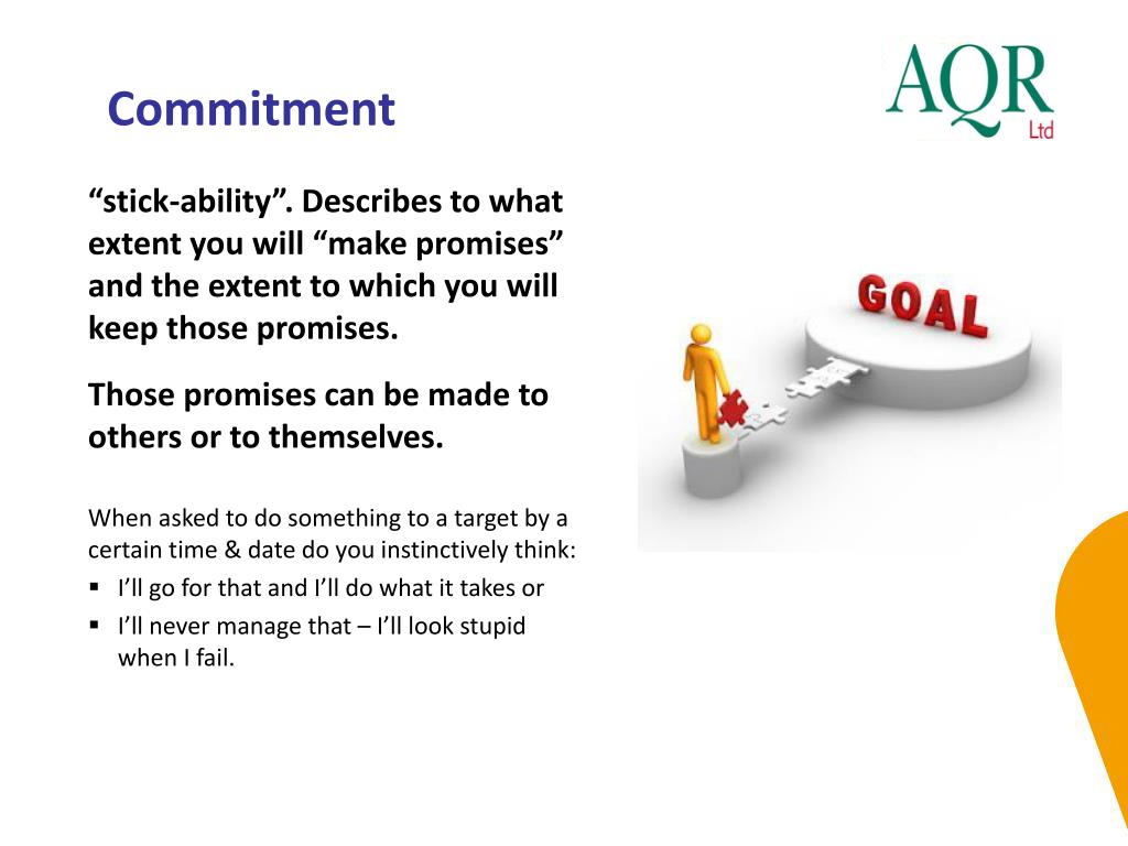 Commitment “stick-ability”. Describes to what extent you will “make promises” and the extent to which you will keep those promises. Those promises can be made to others or to themselves. When asked to do something to a target by a certain time & date do you instinctively think: I’ll go for that and I’ll do what it takes or I’ll never manage that – I’ll look stupid when I fail.