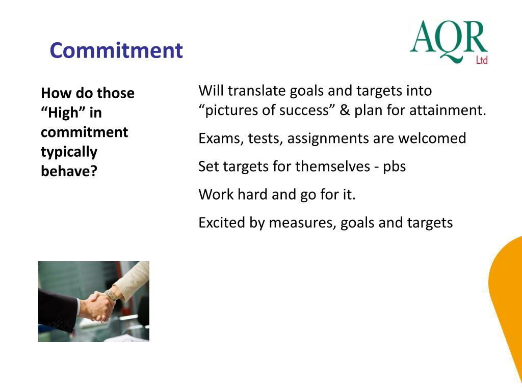 Commitment How do those “High” in commitment typically behave? Will translate goals and targets into “pictures of success” & plan for attainment. Exams, tests, assignments are welcomed Set targets for themselves - pbs Work hard and go for it. Excited by measures, goals and targets