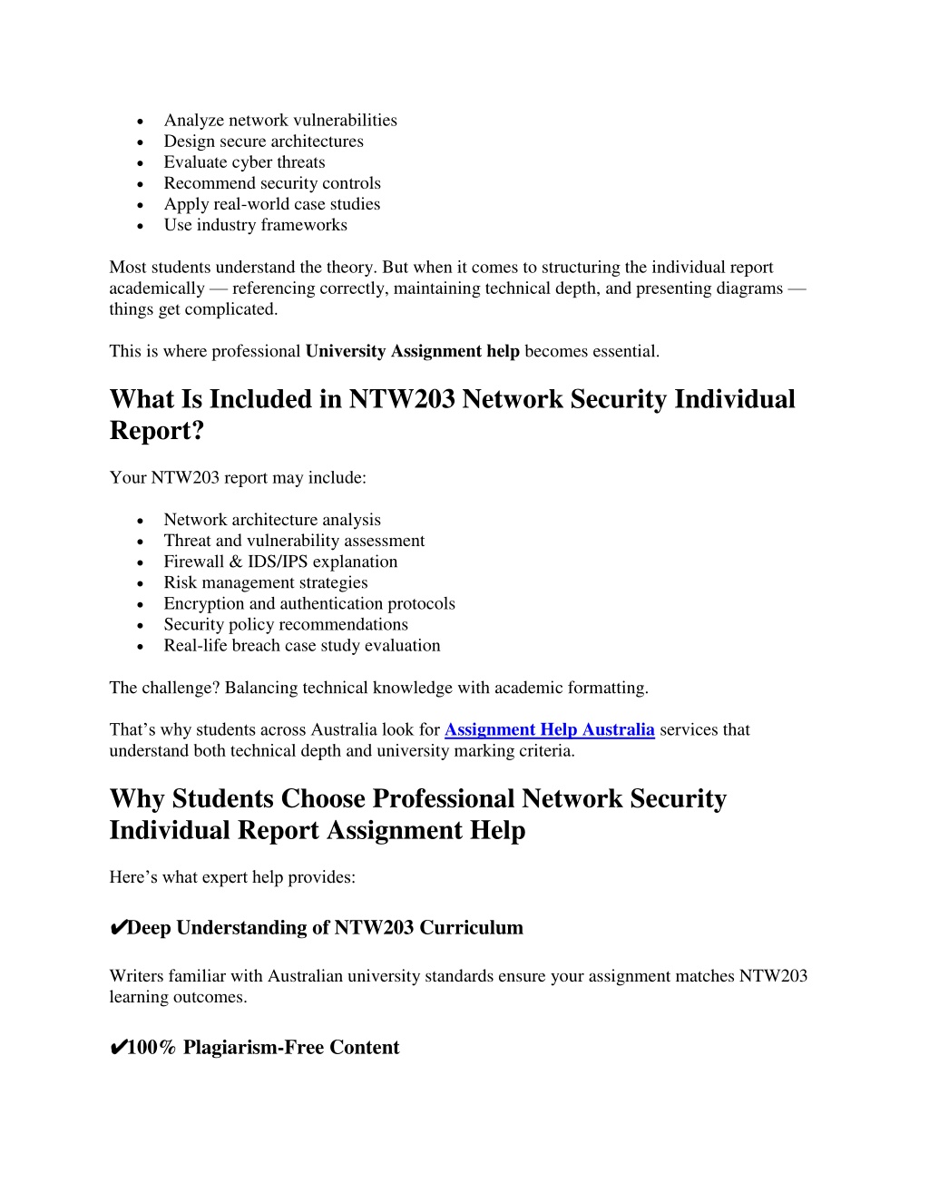 Analyze network vulnerabilities Design secure architectures Evaluate cyber threats Recommend security controls Apply real-world case studies Use industry frameworks Most students understand the theory. But when it comes to structuring the individual report academically — referencing correctly, maintaining technical depth, and presenting diagrams — things get complicated. This is where professional University Assignment help becomes essential. What Is Included in NTW203 Network Security Individual Report? Your NTW203 report may include: Network architecture analysis Threat and vulnerability assessment Firewall & IDS/IPS explanation Risk management strategies Encryption and authentication protocols Security policy recommendations Real-life breach case study evaluation The challenge? Balancing technical knowledge with academic formatting. That’s why students across Australia look for Assignment Help Australia services that understand both technical depth and university marking criteria. Why Students Choose Professional Network Security Individual Report Assignment Help Here’s what expert help provides: ✔ ✔ Deep Understanding of NTW203 Curriculum Writers familiar with Australian university standards ensure your assignment matches NTW203 learning outcomes. ✔ ✔ 100% Plagiarism-Free Content