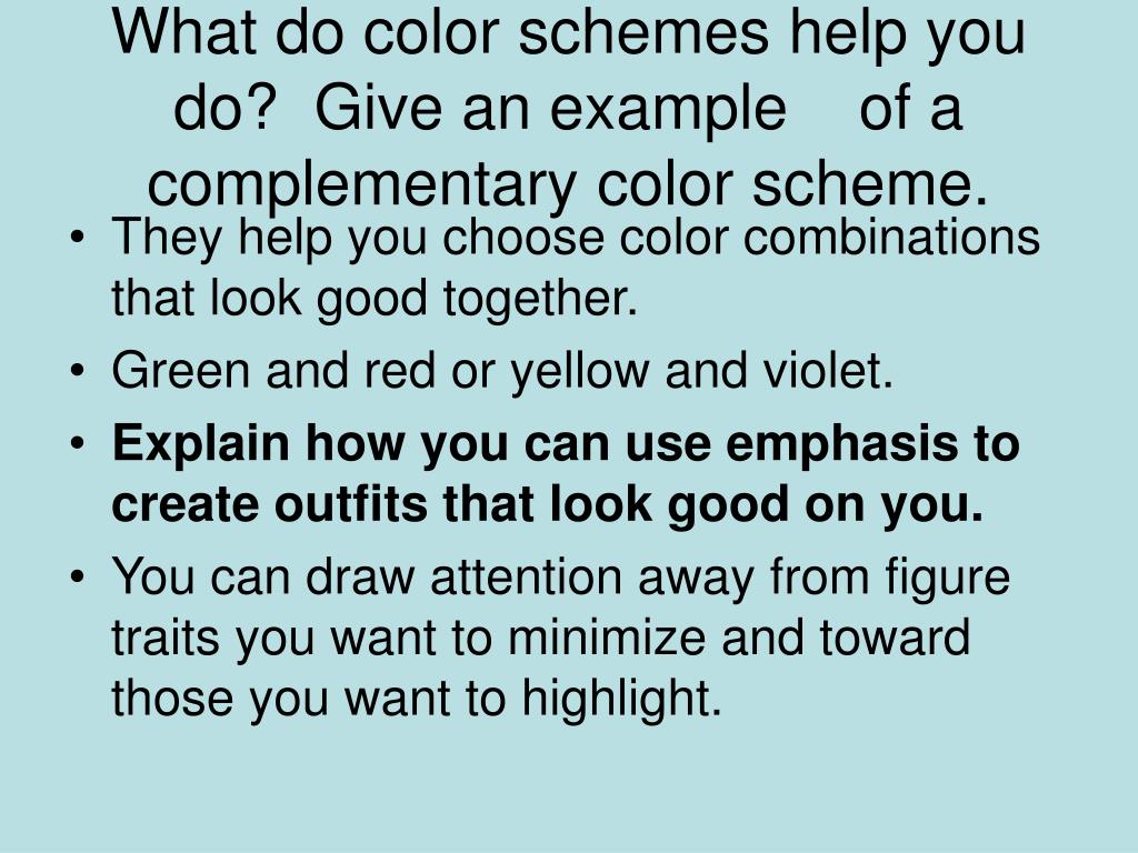 What do color schemes help you do? Give an example of a complementary color scheme. • They help you choose color combinations that look good together. • Green and red or yellow and violet. • Explain how you can use emphasis to create outfits that look good on you. • You can draw attention away from figure traits you want to minimize and toward those you want to highlight.