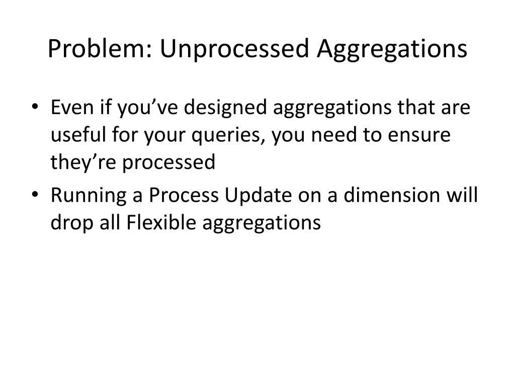 Problem: Unprocessed Aggregations • Even if you’ve designed aggregations that are useful for your queries, you need to ensure they’re processed • Running a Process Update on a dimension will drop all Flexible aggregations