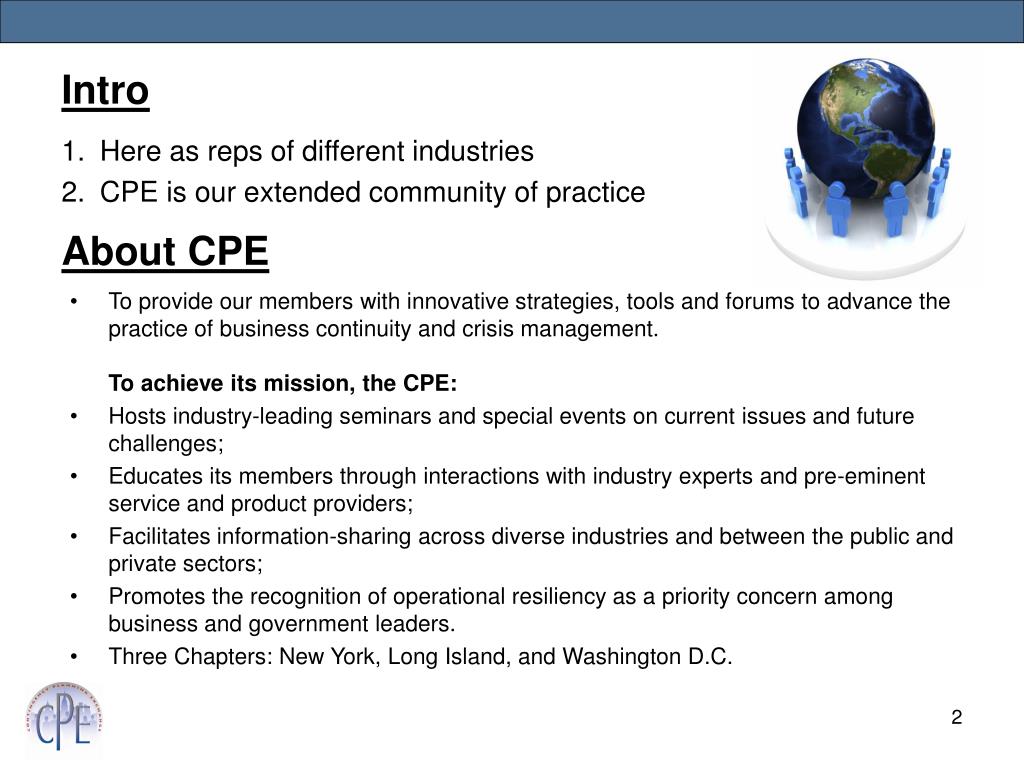 Intro 1. Here as reps of different industries 2. CPE is our extended community of practice About CPE • To provide our members with innovative strategies, tools and forums to advance the practice of business continuity and crisis management. To achieve its mission, the CPE: • Hosts industry-leading seminars and special events on current issues and future challenges; • Educates its members through interactions with industry experts and pre-eminent service and product providers; • Facilitates information-sharing across diverse industries and between the public and private sectors; • Promotes the recognition of operational resiliency as a priority concern among business and government leaders. • Three Chapters: New York, Long Island, and Washington D.C.