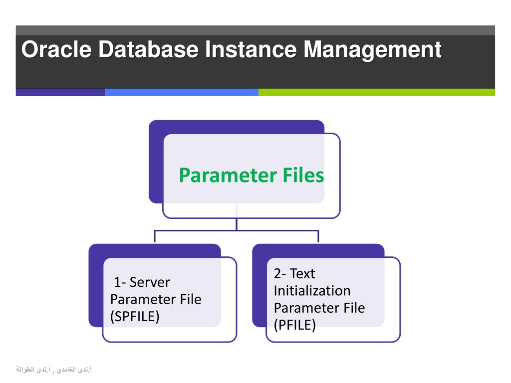 Oracle Database Instance Management - After being read from a file, initialization parameters are retained in memory, where the values for many of them can be changed dynamically. There are two types of parameter files. The type of file used to start the instance determines if dynamic initialization parameter changes persist across database shutdown and startup. أ.ندى الغامدي , أ.ندى الطوالة
