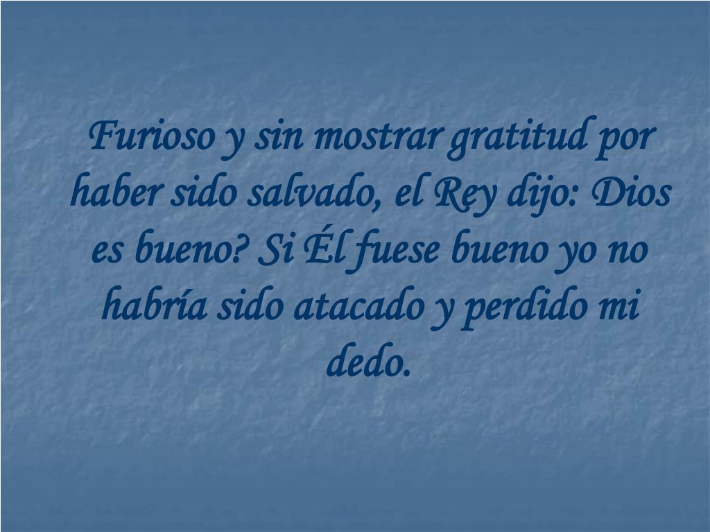 Furioso y sin mostrar gratitud por haber sido salvado, el Rey dijo: Dios es bueno? Si Él fuese bueno yo no habría sido atacado y perdido mi dedo.
