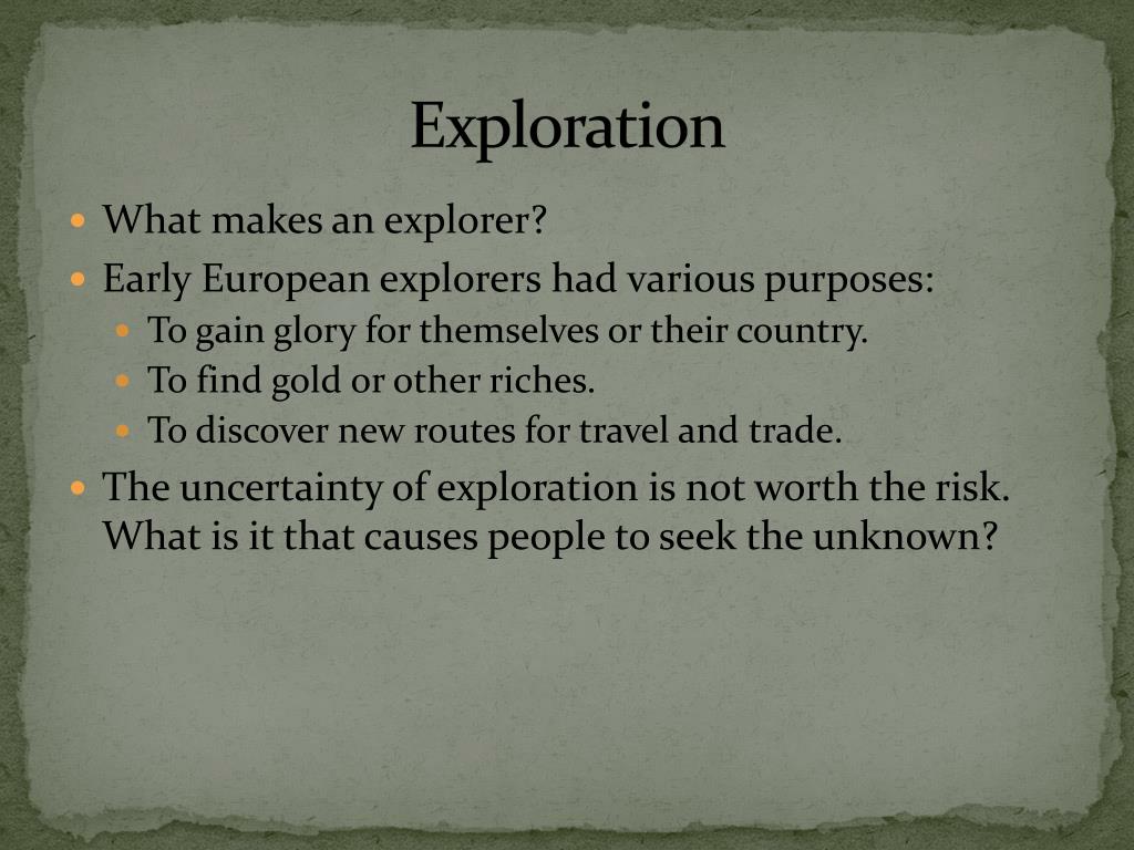 Exploration • What makes an explorer? • Early European explorers had various purposes: • To gain glory for themselves or their country. • To find gold or other riches. • To discover new routes for travel and trade. • The uncertainty of exploration is not worth the risk. What is it that causes people to seek the unknown?