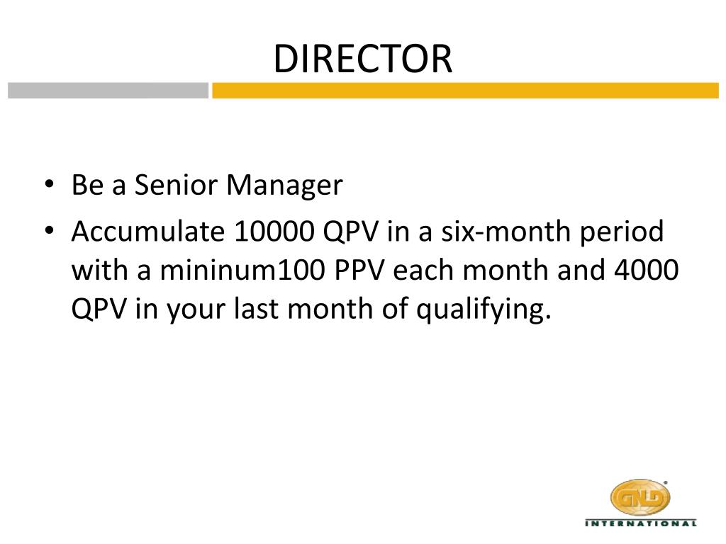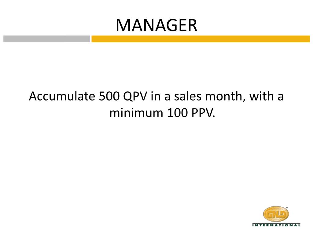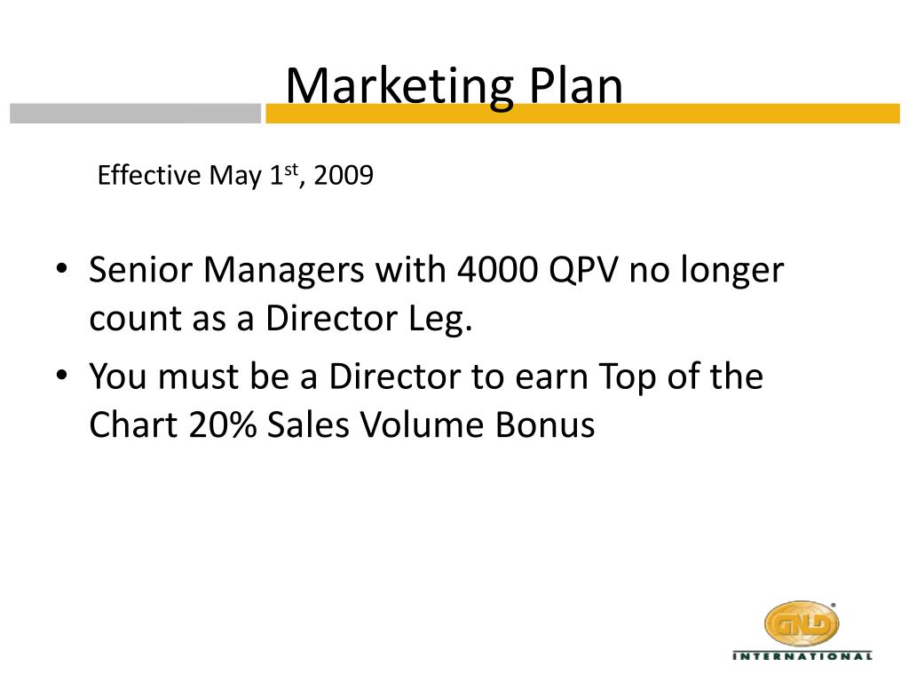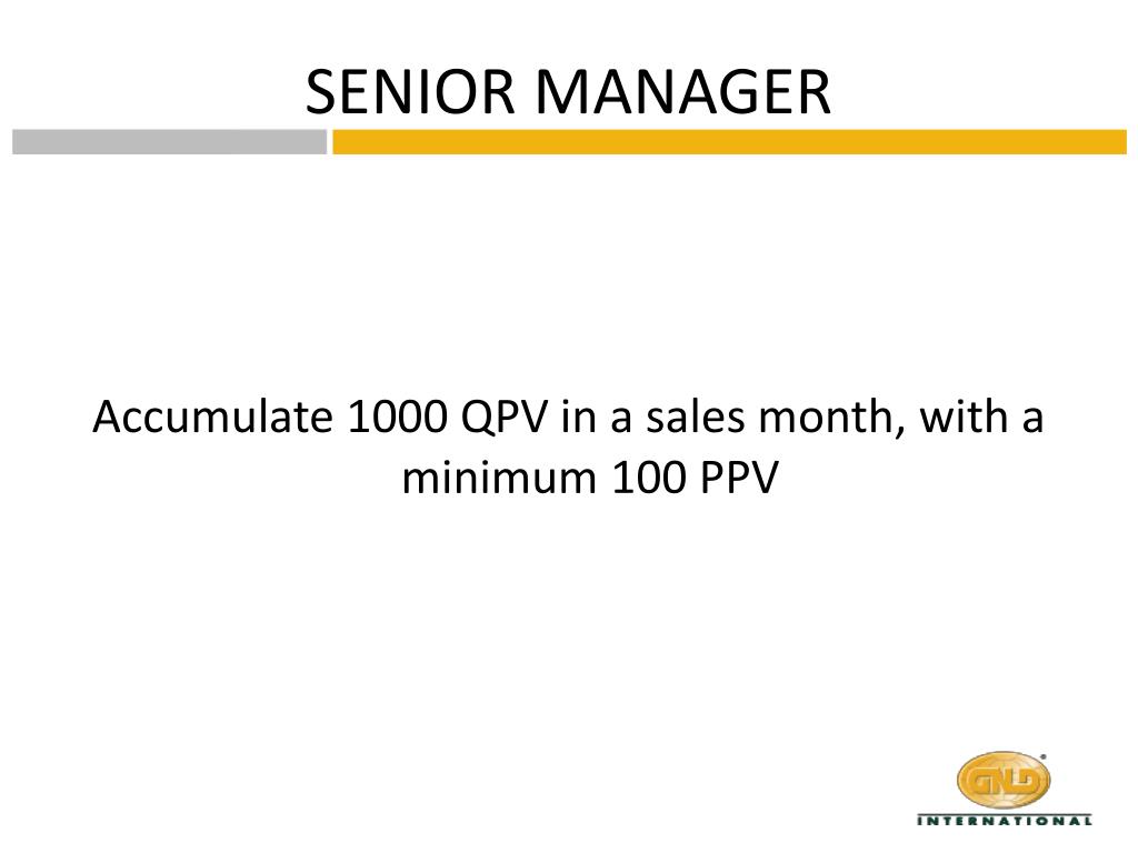 GNLD Marketing Plan Effective: May 1, 2009. MANAGER. Accumulate 500 QPV in a sales month, with a minimum 100 PPV. SENIOR MANAGER. Accumulate 1000 QPV in a sales month, with a minimum 100 PPV. DIRECTOR. Be a Senior Manager