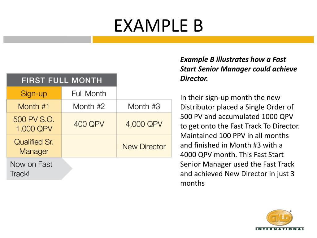 EXAMPLE B Example B illustrates how a Fast Start Senior Manager could achieve Director. In their sign-up month the new Distributor placed a Single Order of 500 PV and accumulated 1000 QPV to get onto the Fast Track To Director. Maintained 100 PPV in all months and finished in Month #3 with a 4000 QPV month. This Fast Start Senior Manager used the Fast Track and achieved New Director in just 3 months