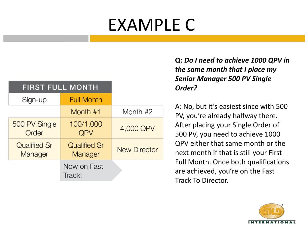 EXAMPLE C Q: Do I need to achieve 1000 QPV in the same month that I place my Senior Manager 500 PV Single Order? A: No, but it’s easiest since with 500 PV, you’re already halfway there. After placing your Single Order of 500 PV, you need to achieve 1000 QPV either that same month or the next month if that is still your First Full Month. Once both qualifications are achieved, you’re on the Fast Track To Director.