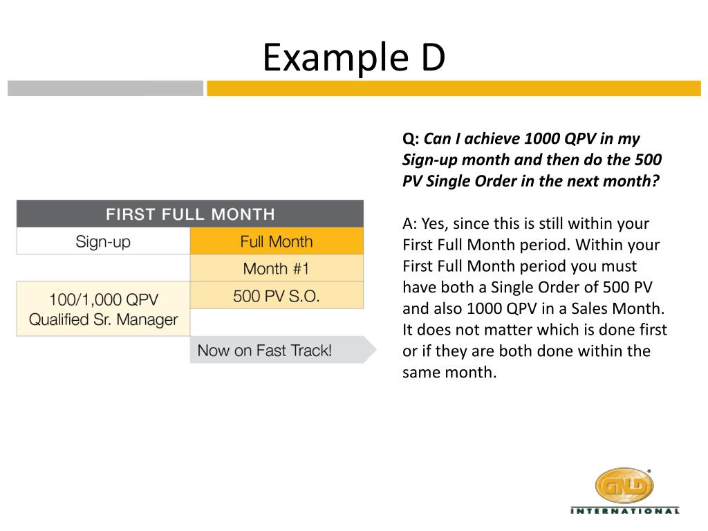 Example D Q: Can I achieve 1000 QPV in my Sign-up month and then do the 500 PV Single Order in the next month? A: Yes, since this is still within your First Full Month period. Within your First Full Month period you must have both a Single Order of 500 PV and also 1000 QPV in a Sales Month. It does not matter which is done first or if they are both done within the same month.