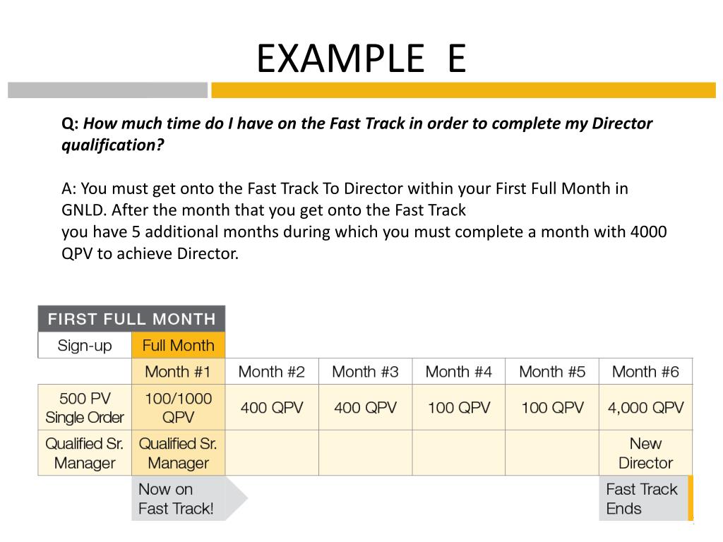 EXAMPLE E Q: How much time do I have on the Fast Track in order to complete my Director qualification? A: You must get onto the Fast Track To Director within your First Full Month in GNLD. After the month that you get onto the Fast Track you have 5 additional months during which you must complete a month with 4000 QPV to achieve Director.