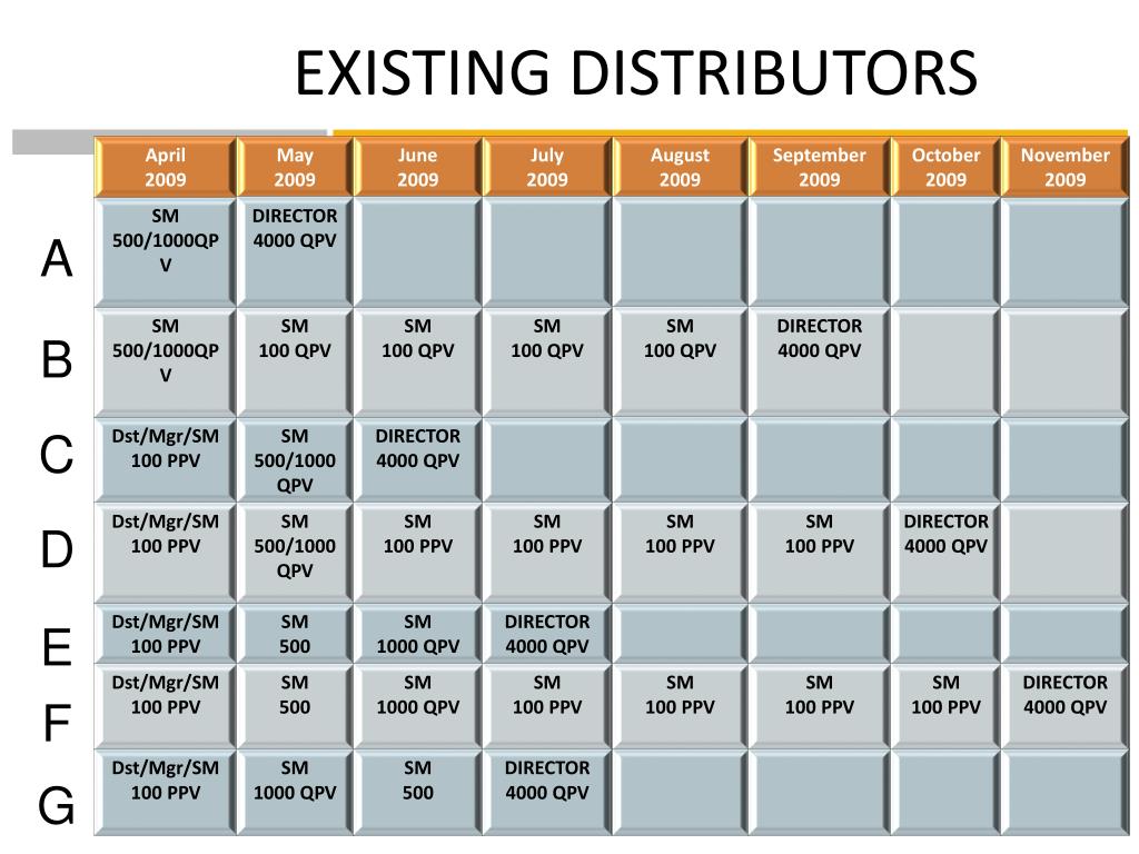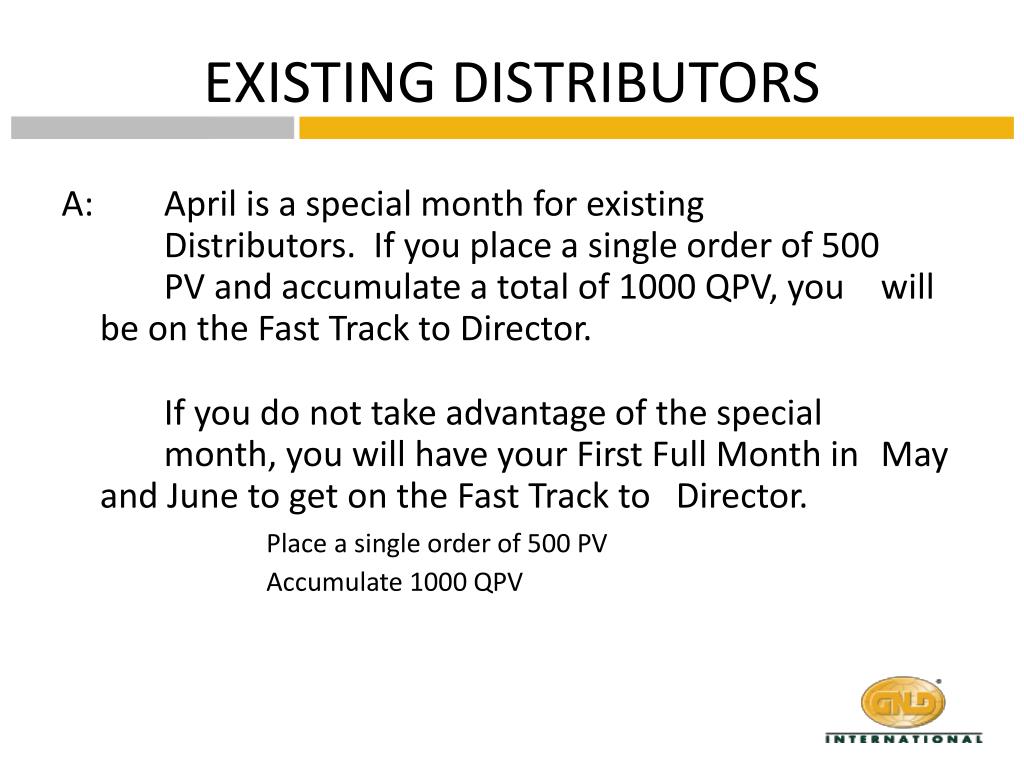 EXISTING DISTRIBUTORS A: April is a special month for existing Distributors. If you place a single order of 500 PV and accumulate a total of 1000 QPV, you will be on the Fast Track to Director. If you do not take advantage of the special month, you will have your First Full Month in May and June to get on the Fast Track to Director. Place a single order of 500 PV Accumulate 1000 QPV