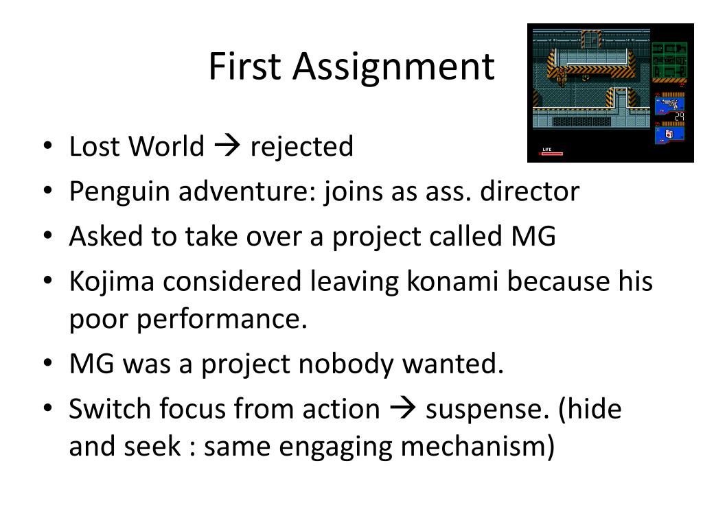 First Assignment • Lost World rejected • Penguin adventure: joins as ass. director • Asked to take over a project called MG • Kojima considered leaving konami because his poor performance. • MG was a project nobody wanted. • Switch focus from action suspense. (hide and seek : same engaging mechanism)