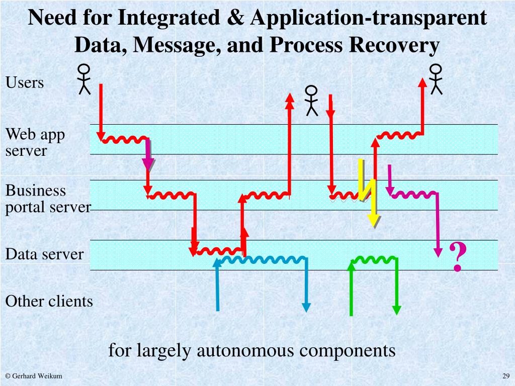 Need for Integrated & Application-transparent Data, Message, and Process Recovery Users Web app server Business portal server ? Data server Other clients for largely autonomous components