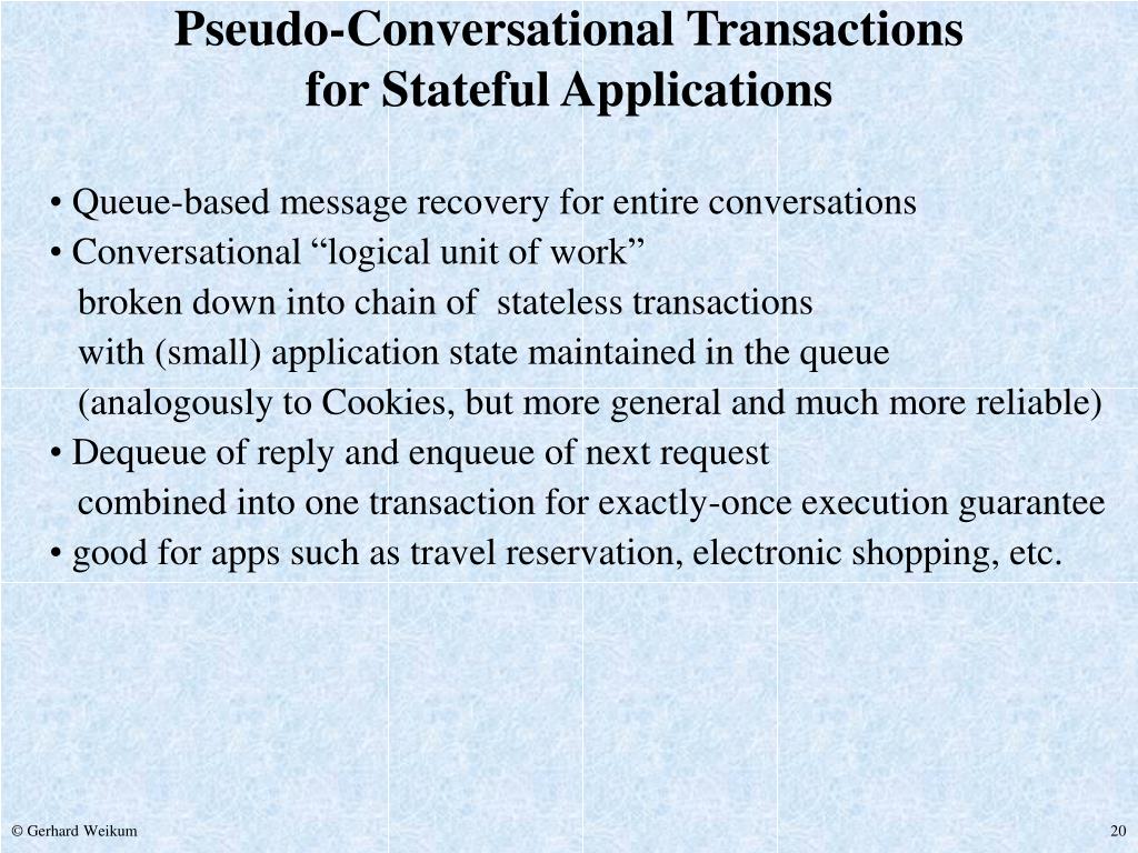stateless application • (running on client, or app server or data server): • user sends input message • app program sends request message to data server • data server executes transaction and sends reply message to app • app program sends output message to user • there are no conversations with the user within a transaction, • and subsequent transactions are independent • Solution Queued Transactions: • message recovery by queue manager • with persistent, recoverable message queues • exactly-once execution by enclosing • message dequeue and enqueue into transaction Stateless Applications Based on Queues