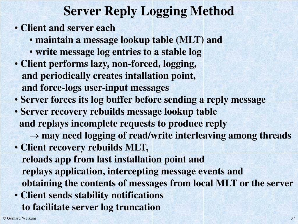 MSN Type 15 input lazy logging 20 request 40 reply installation point 45 output ... 65 input 70 request client server ... stable log file MSN Type message lookup table 10 request ... ... 20 request 30 reply 40 reply ... force log upon reply 70 request 80 reply Data Structures for Server Reply Logging