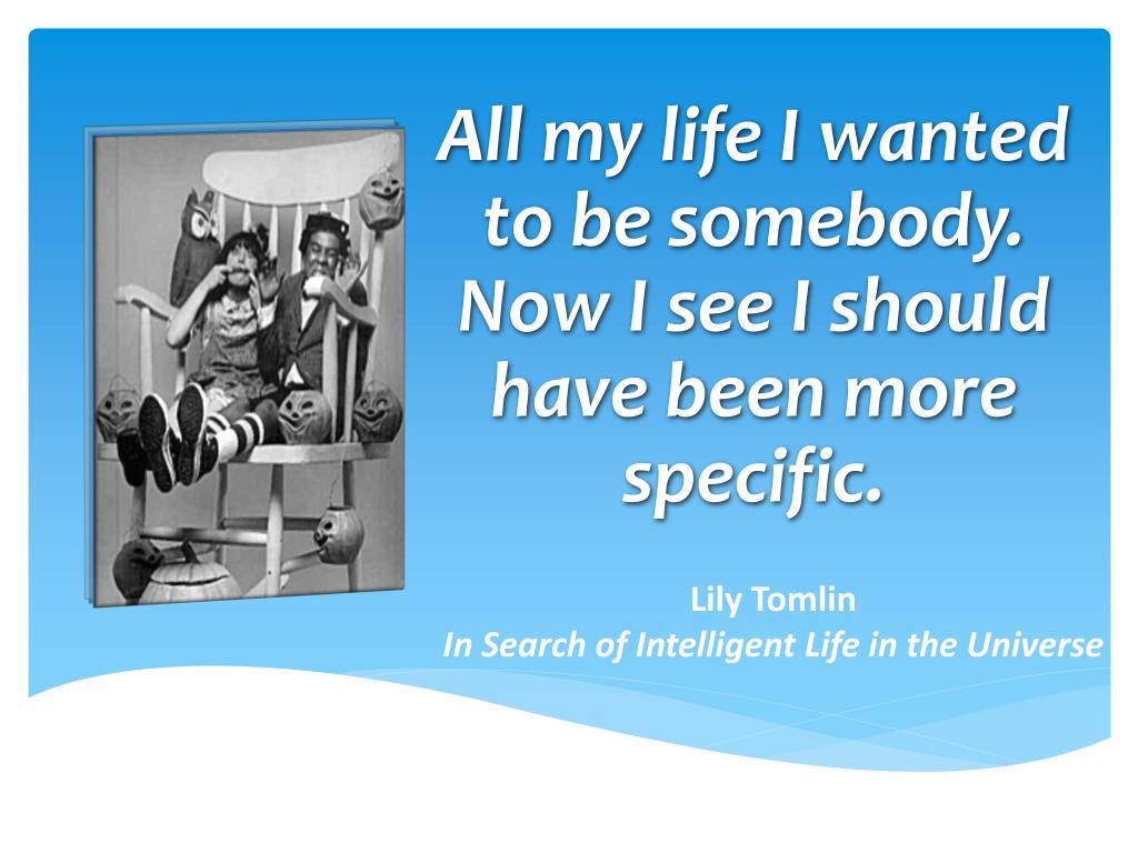 All my life I wanted to be somebody. Now I see I should have been more specific. Lily Tomlin In Search of Intelligent Life in the Universe
