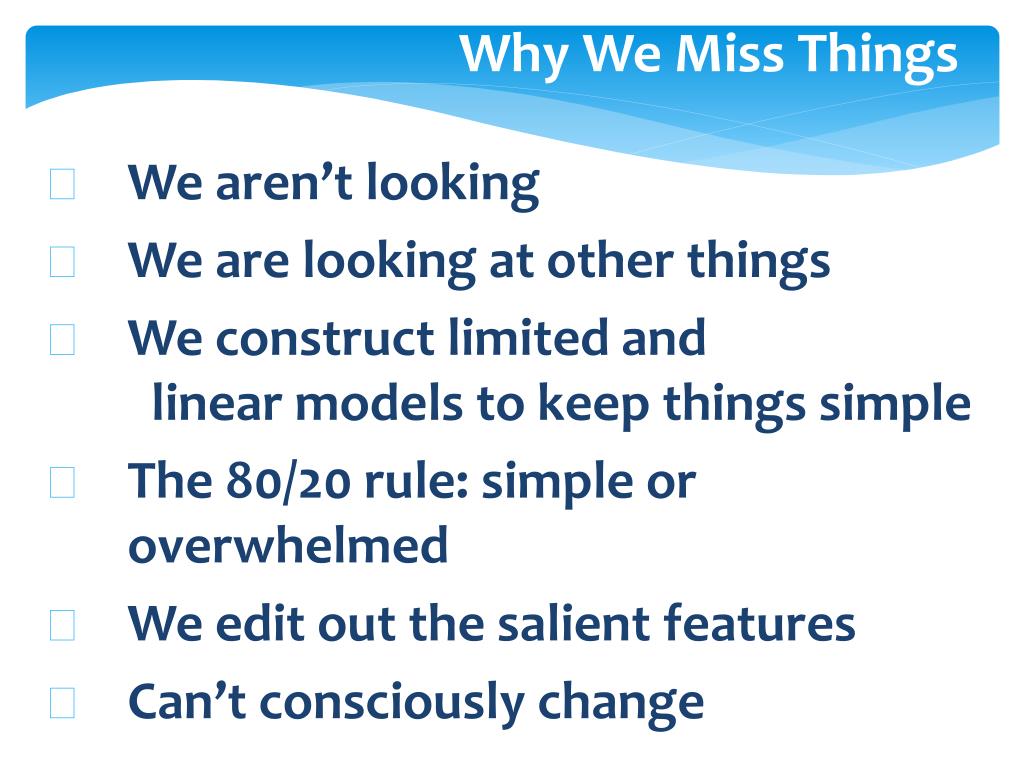 Why We Miss Things • We aren’t looking • We are looking at other things • We construct limited and linear models to keep things simple • The 80/20 rule: simple or overwhelmed • We edit out the salient features • Can’t consciously change