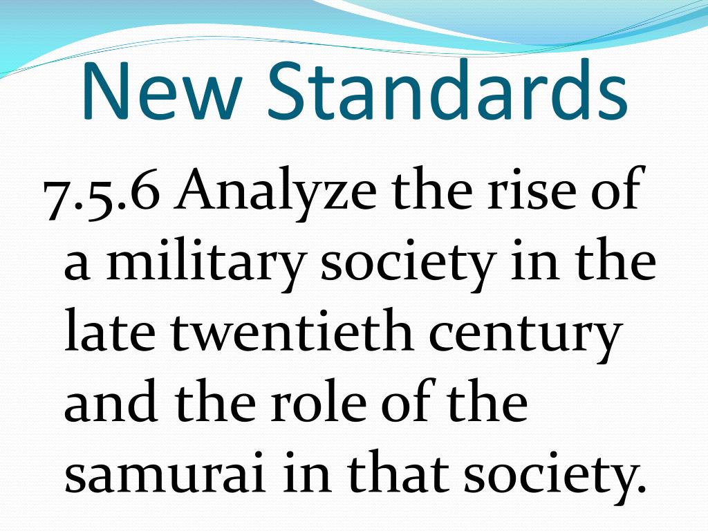 New Standards 7.5.6 Analyze the rise of a military society in the late twentieth century and the role of the samurai in that society. Analyze: to study by looking at the different parts.