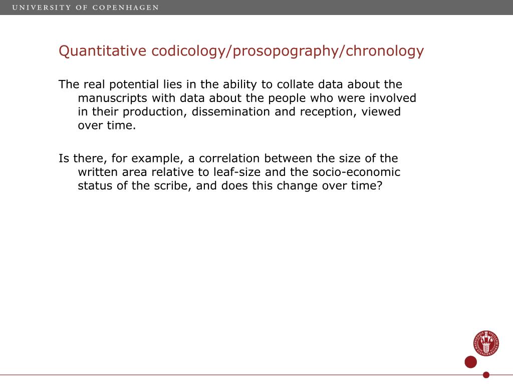 Quantitative codicology/prosopography/chronology The real potential lies in the ability to collate data about the manuscripts with data about the people who were involved in their production, dissemination and reception, viewed over time. Is there, for example, a correlation between the size of the written area relative to leaf-size and the socio-economic status of the scribe, and does this change over time?