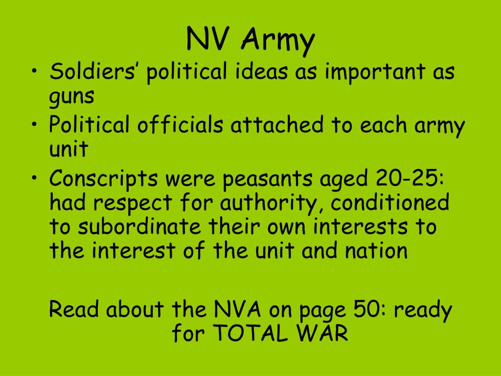 NV Army • Soldiers’ political ideas as important as guns • Political officials attached to each army unit • Conscripts were peasants aged 20-25: had respect for authority, conditioned to subordinate their own interests to the interest of the unit and nation Read about the NVA on page 50: ready for TOTAL WAR