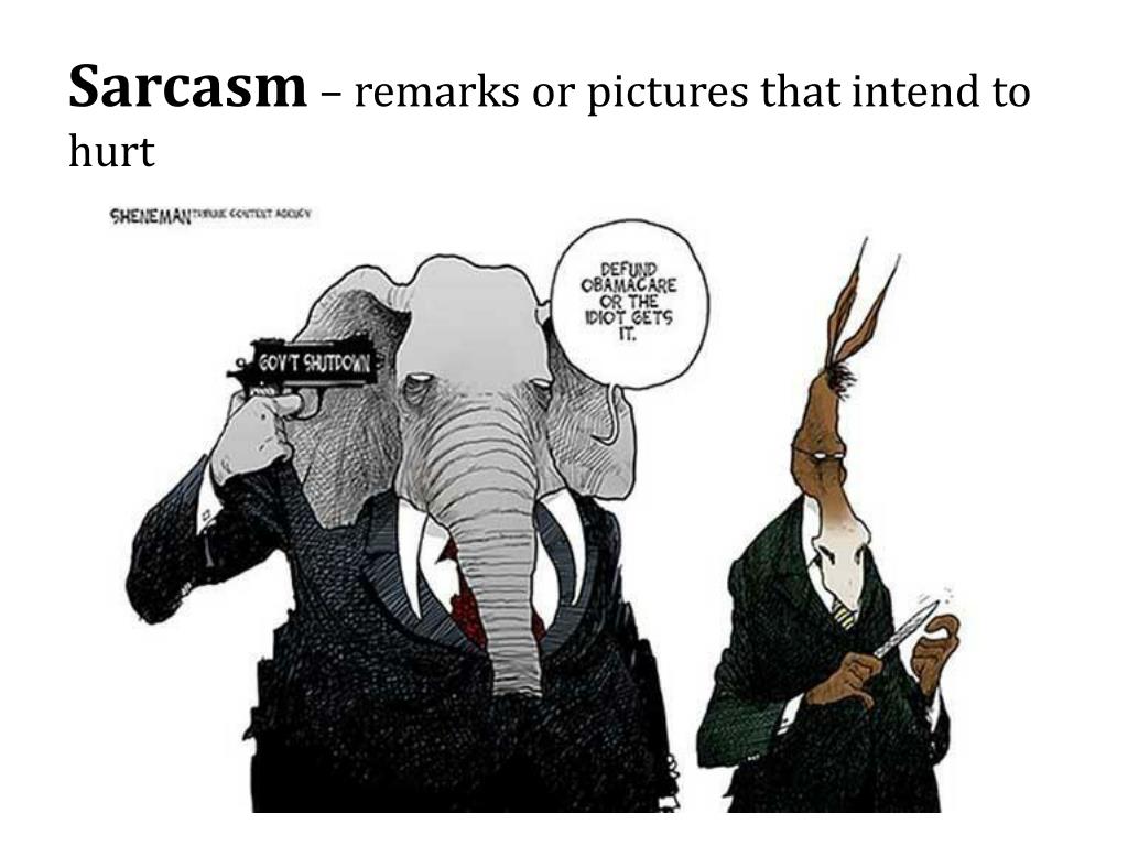 Political Cartoon Elements Caricatures Symbolism Irony Labeling Sarcasm The goals of a political cartoon are to influence public opinion and to depict what is currently going on in US government