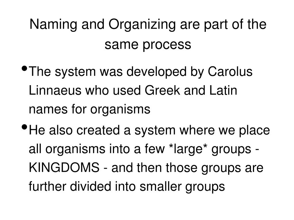 Naming and Organizing are part of the same process • The system was developed by Carolus Linnaeus who used Greek and Latin names for organisms • He also created a system where we place all organisms into a few *large* groups - KINGDOMS - and then those groups are further divided into smaller groups