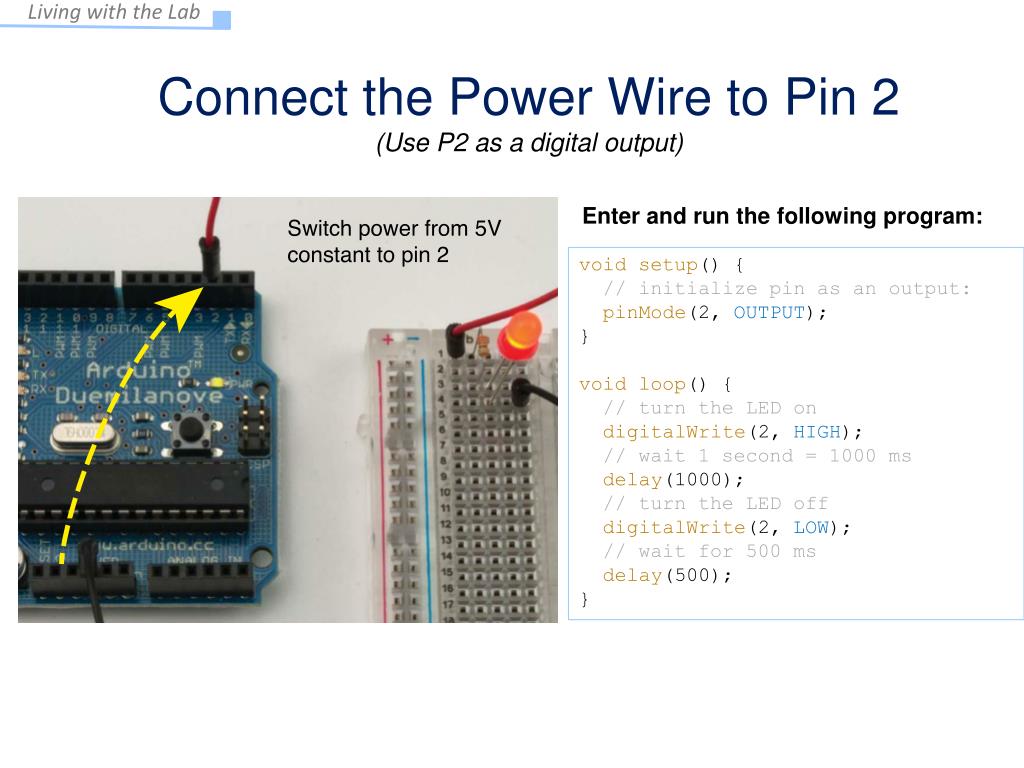 Connect the Power Wire to Pin 2 (Use P2 as a digital output) Enter and run the following program: void setup() { // initialize pin as an output: pinMode(2, OUTPUT); } void loop() { // turn the LED on digitalWrite(2, HIGH); // wait 1 second = 1000 ms delay(1000); // turn the LED off digitalWrite(2, LOW); // wait for 500 ms delay(500); }