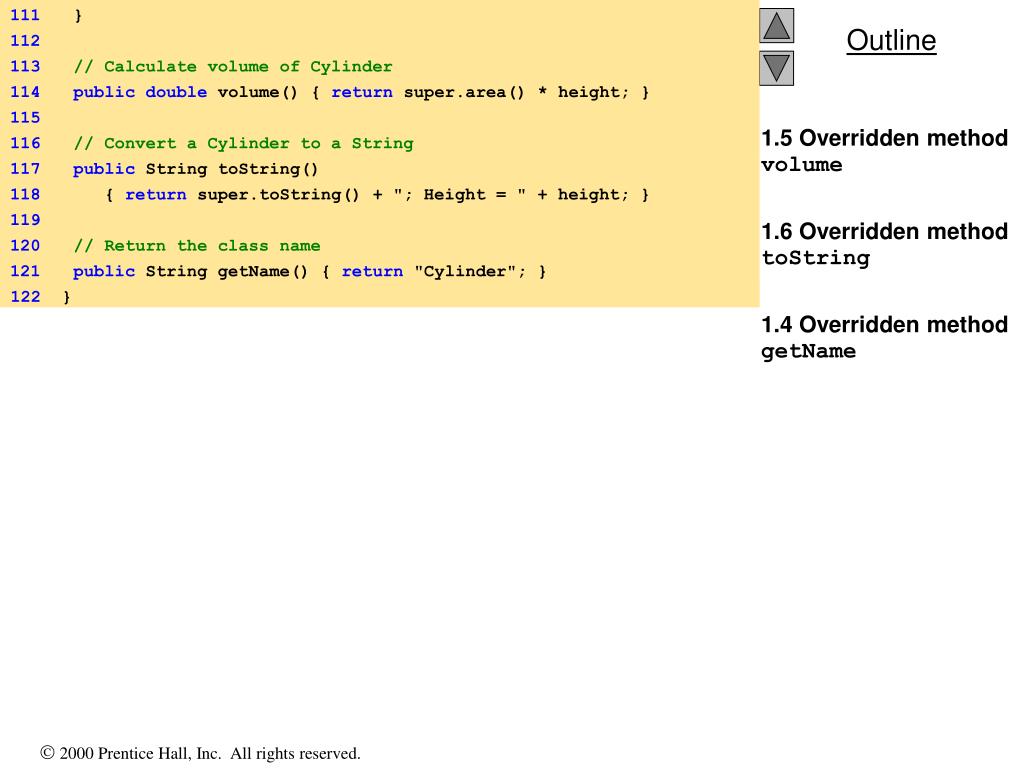 1.5 Overridden method volume 1.6 Overridden method toString 1.4 Overridden method getName 111 } 112 113 // Calculate volume of Cylinder 114 publicdouble volume() { return super.area() * height; } 115 116 // Convert a Cylinder to a String 117 public String toString() 118 { return super.toString() + "; Height = " + height; } 119 120 // Return the class name 121 public String getName() { return "Cylinder"; } 122 } 122 }
